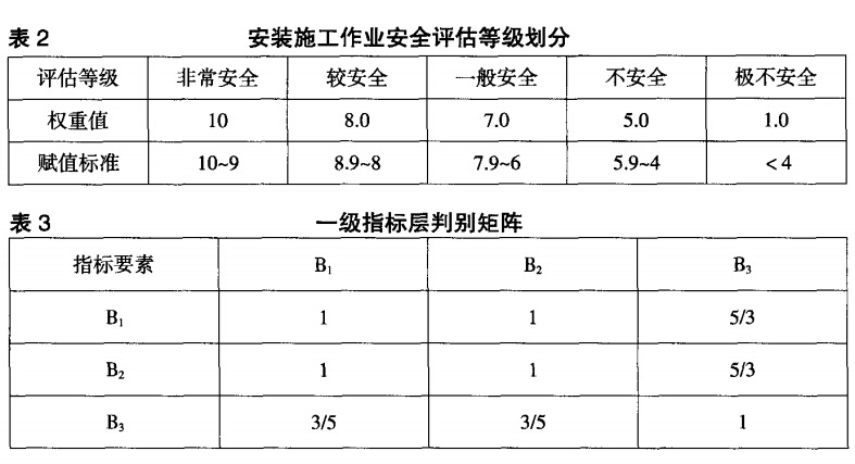3.3一級(jí)指標(biāo)層及二級(jí)指標(biāo)層權(quán)重集合計(jì)算針對(duì)同一層次各指標(biāo)要素實(shí)施兩兩比較從構(gòu)建判別矩陣,一級(jí)指標(biāo)層的判別矩陣如表3所示。針對(duì)上述指標(biāo)層的判別矩陣進(jìn)行層次單排序及一致性檢驗(yàn),由CI=(n)/(n一1),計(jì)算可知,CI=0.00004,RI=0.56。CR=CI,RI小于0.1,即為相應(yīng)判別陣滿足一致性檢驗(yàn)要求。同時(shí),結(jié)合專家咨詢結(jié)果以及該安裝工程橋式起重機(jī)設(shè)備的安裝資料,可采用上述方法求得各二級(jí)指標(biāo)層對(duì)應(yīng)一級(jí)指標(biāo)層的相對(duì)權(quán)重值并對(duì)各二級(jí)指標(biāo)要素評(píng)分賦值,如表4所示。