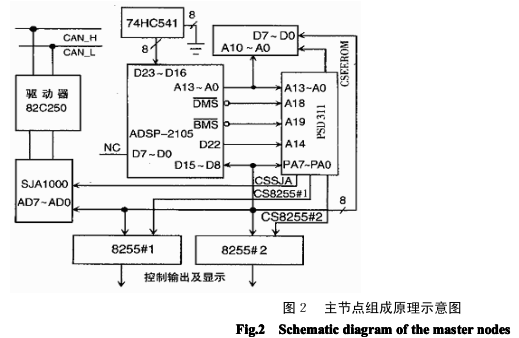 系統(tǒng)主節(jié)點(diǎn)結(jié)構(gòu)原理圖,如圖 2 所示。 中央處理器采用美國(guó)模擬器件公司生產(chǎn)的 ADSP2105。它是一種高性價(jià)比、性能成熟的 DSP 器件, 在一個(gè) 100ns 周期內(nèi),可以完成如下操作:取兩個(gè)操作數(shù),修改指向操作數(shù)的地址單元,使兩個(gè)操作數(shù)相乘 并將結(jié)果累加到一個(gè) 40 位的和中。由于程序循環(huán)在硬件內(nèi)完成,所以每 100ns 能執(zhí)行一次這些高級(jí)指令 的操作。WSI 的 PSD311 可編程外圍器件有效地將可編程邏輯、I/O 端口和存儲(chǔ)器集成在一塊芯片上,可 以實(shí)現(xiàn)本系統(tǒng)的外圍功能。ADSP2105 在與 PSD311 等外圍器件聯(lián)絡(luò)方面提供了很大的時(shí)序靈活性。它 可以為 4 個(gè)分開的存儲(chǔ)器空間中的每一個(gè)單獨(dú)分配等待狀態(tài)數(shù)量,以適應(yīng)很寬的時(shí)序差別。我們?cè)?ADSP2105 的 “ 等待寄存器”為 EPROM、RAM 和外部存儲(chǔ)器的選通脈沖安排 1 個(gè)等待狀態(tài),即 200ns 周期 時(shí)間,以滿足 PSD311 120ns 器件的時(shí)序要求。由于總線的通路布在 ADSP2105 的里面,PSD311 的數(shù)據(jù)線 與 D15~D8 連接。ADSP2105 的 “ D22”線提供 PSD311 的 “ A14”地址線,BMS(Boot Memory Select)充當(dāng) EPROM 的片選并與 PSD311 的 “ A19”輸入相連接。 選用 SJA1000 作為 CAN 控制器,驅(qū)動(dòng)器使用 CAN 控制器接口芯片 PCA82C250。EEPROM 用作數(shù)據(jù) RAM,用于保存設(shè)置輸入的關(guān)鍵數(shù)據(jù),以防掉電時(shí)丟失。
