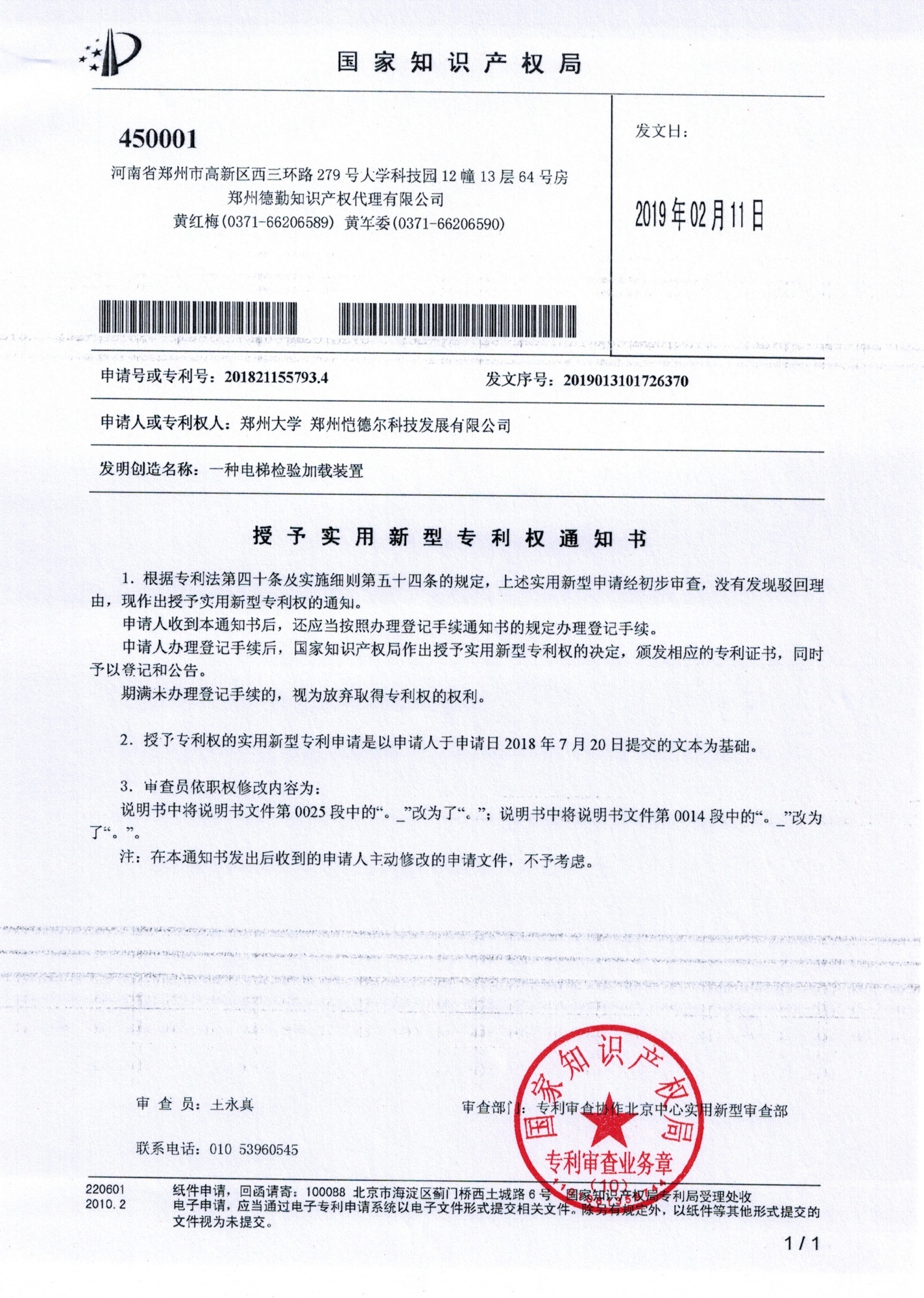近日,由鄭州愷德爾科技發(fā)展有限公司撰寫申請的“一種電梯檢驗(yàn)加載裝置”獲得國家專利局授權(quán)!